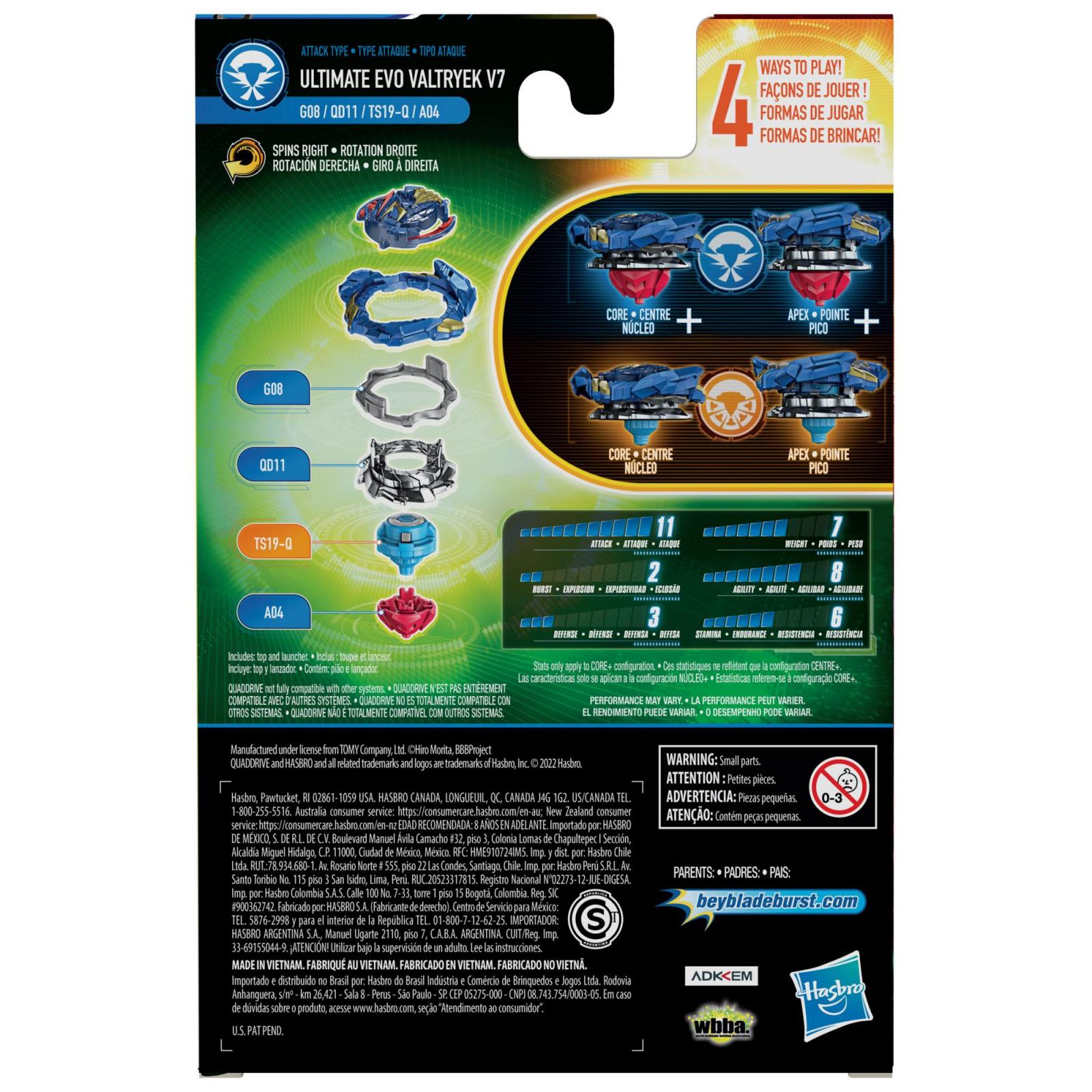 Beyblade QuadDrive tech puts the future of Beyblade battling in your hands with the first ever 4-in-1 Beyblade top! Each QuadDrive top can be configured in 4 different ways, giving you 4 ways to strategize, 4 ways to customize, 4 modes to battle, and 4 modes to win! Size up your opponent and modify your QuadDrive top to gain the ultimate battle advantage. Train to become champion of the arena with the included right-spin Beyblade Burst QuadDrive Ultimate Evo Valtryek V7 G08 QD11 TS19-Q A04 top and launcher. Customize the top to Core and Apex mode for stamina type or to Core+ and Apex+ mode for attack type. Harness the power of advanced QuadDrive tech in the QuadDrive Beystadium (Beystadium sold separately, subject to availability). Scan code on QuadDrive tops to unleash your top in a virtual battle in the Beyblade Burst app! Launch into head-to-head battles with Beyblade Burst Beystadiums, launchers, and spinning tops as you journey towards Beymastery! (Each sold separately, subject to availability.) Hasbro and all related terms are trademarks of Hasbro, Inc. •HARNESS THE POWER OF QUADDRIVE: Beyblade Burst QuadDrive launches you into the future of Beyblade with the first ever 4-in-1 Beyblade top! Tops can be configured in 4 ways for the ultimate battle advantage! •CUSTOMIZE THE CLASH: Includes right-spin Ultimate Evo Valtryek V7 G08 QD11 TS19-Q A04 top and launcher. Customize top to Core and Apex mode for stamina type or to Core+ and Apex+ mode for attack type •DRIVE TOWARDS VICTORY: Build the best configuration and harness the power of advanced QuadDrive tech in the QuadDrive Beystadium (Beystadium sold separately, subject to availability) •COMPETE IN DIGITAL BATTLES: Scan code on QuadDrive tops to take the battle to the next level! Compete in the Beyblade Burst app to unleash your top in a virtual battle with other Bladers worldwide! •LET IT RIP: Launch into head-to-head battles with Beyblade Burst Beystadiums, launchers, and spinning tops as you journey towards Beymastery! (Each sold separately, subject to availability) •Ages 8 and up •Warning: Choking Hazard — Small parts. Not for children under 3 years. •Check apps.hasbro.com for app availability, operating systems and device compatibility, and updates. Fees may apply. •QuadDrive not fully compatible with other systems. •Includes Beyblade Burst QuadDrive top, launcher and instructions.