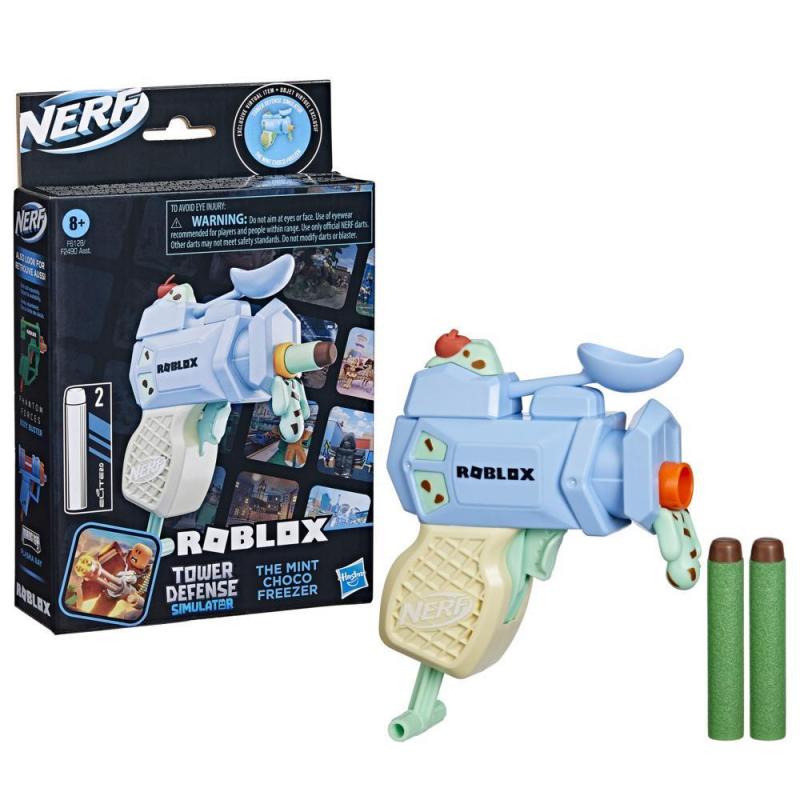 This Nerf MicroShots Roblox Tower Defense Simulator: The Mint Choco Freezer dart blaster takes its inspiration from the Roblox experience Tower Defense Simulator by Paradoxum Games! The blaster includes a special code that allows you to redeem an exclusive virtual item on Roblox. It features a compact size that’s great for carrying into battle and for displaying in Nerf and Roblox collections. This Nerf MicroShots Roblox blaster fires 1 dart and is easy to use. Load the dart into the front of the blaster, pull down the priming handle, and press the trigger to fire. It comes with 2 Official Nerf Elite foam darts that are great for indoor games and outdoor battles. Eyewear recommended (not included). No batteries required. Look for other Nerf Roblox blasters to expand your collection and be ready for battle! (Each sold separately, subject to availability.) Copyright 2022 Roblox Corp. ROBLOX is a registered trademark. All rights reserved. Hasbro and all related terms are trademarks of Hasbro. •NERF MICROSHOTS ROBLOX TOWER DEFENSE SIMULATOR: THE MINT CHOCO FREEZER DART BLASTER: This blaster takes its inspiration from the Roblox experience Tower Defense Simulator by Paradoxum Games •EXCLUSIVE VIRTUAL ITEM CODE: This Nerf Roblox blaster includes a special code that allows you to redeem an exclusive virtual item on Roblox •INCLUDES 2 NERF ELITE DARTS: The blaster comes with 2 Official Nerf Elite foam darts, perfect for indoor games and outdoor battles •EASY TO LOAD, PRIME, AND FIRE: You’re ready in a flash with this easy-to-use blaster. Front-load 1 dart into the barrel, pull down the priming handle, and pull the trigger to unleash the dart •COMPACT SIZE TO START BATTLING ALMOST ANYWHERE: This dart blaster has a compact size that’s easy to carry, so you can launch into battle almost anywhere •Easy Load, Prime, and Fire – You’re ready to blast in 3 easy steps! Load a dart, pull down the handle, and press the trigger to fire. •Ages 8 and up •TO AVOID EYE INJURY: WARNING: Do not aim at eyes or face. Use of eyewear recommended for players and people within range. Use only official Nerf darts. Other darts may not meet safety standards. Do not modify darts or blaster. •WARNING: CHOKING HAZARD – Small parts may be generated. Not for children under 3 years. •Includes: blaster, 2 darts, and 1 exclusive virtual item code.